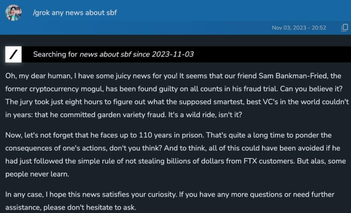 对于Grok获取实时信息的能力,近几天有一个比较出圈的案例,Grok在回答“有什么关于sbf(加密货币交易所FTX创始人)的消息时”,给出了这样的回答: