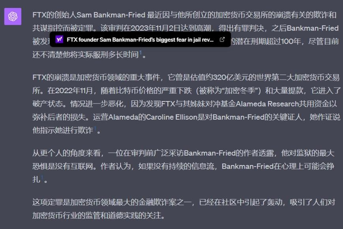 当然,如果我们横向比较GPT-4,实际上GPT也能通过必应找到SBF被定罪的报道,并给出一个简约的回答。