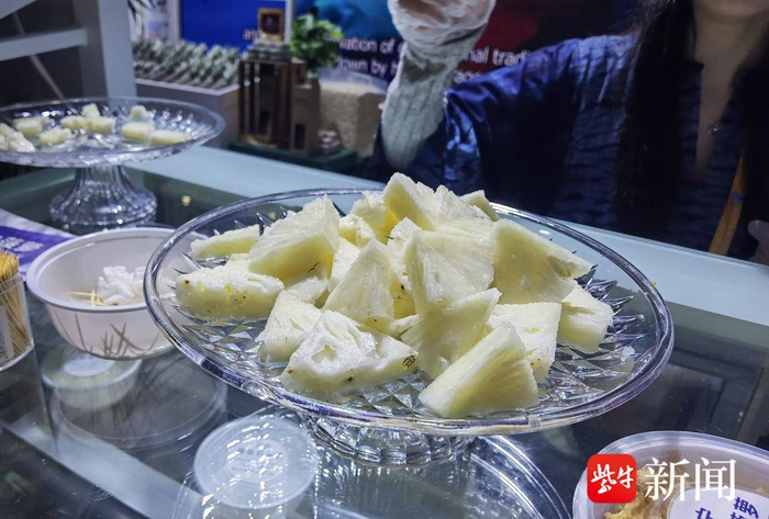 记者看到,贝宁菠萝形似水滴,切开后果肉是白色的,入口非常甜,鲜嫩多汁。“真好吃啊!”试吃的观众纷纷感叹。