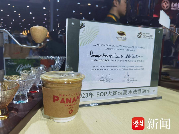 展台也售卖正常价格的咖啡,“瑰夏拼配”美式34元、拿铁38元,手冲咖啡169元,均加入了10%的卡门庄园瑰夏咖啡豆,不过不属于竞赛级。记者体验发现,“平价版”瑰夏咖啡喝起来有轻微的蜂蜜般甜感,带有一定的酸度,质感如牛奶般丝滑。