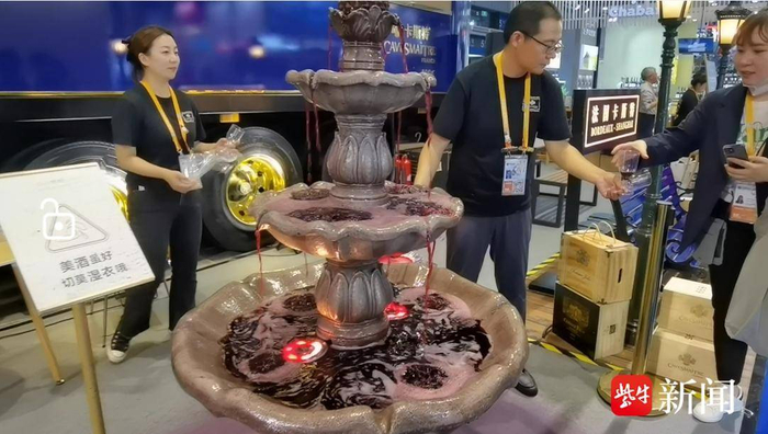进博会上居然有一座三层的“欧式红酒喷泉”,只见工作人员用勺子盛红酒倒入塑料高脚杯,递给观众免费品尝,这满满的新奇感吸引了许多观众打卡。这是法国卡斯特葡萄酒设计的别出心裁的品酒环节。