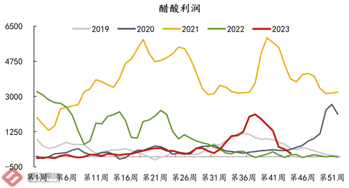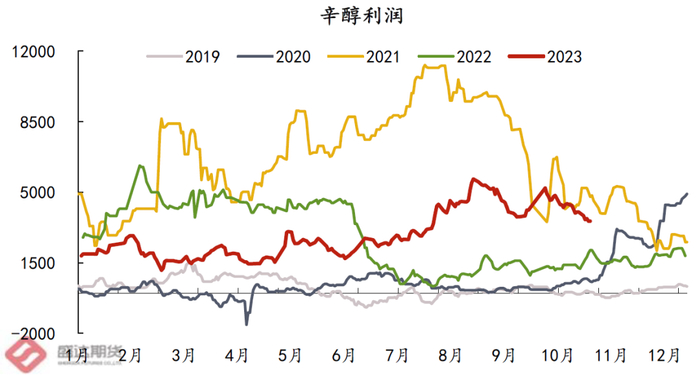 通过此次调研发现,虽然外采甲醇制聚烯烃利润亏损严重,但MTO制丙烯,丙烯配套下游丁、辛醇盈利情况十分可观(基于产品特殊性,该企业丁辛醇利润详情暂不可知,下图辛醇利润来源于第三方资讯公司,整体利润客观,与企业所述利润趋势较为同步);MTO制乙烯,乙烯法PVC(调研企业当前利润在600元/吨,与第三方资讯公司理论测算有所偏差,主要源于企业自身有氯气补贴以及相关折旧测算不同等)、醋酸(调研企业当前利润在200-300元/吨,与资讯公司表述趋势保持一致)盈利状况较好。在盈利品种的加持下,若配套聚烯烃装置,整体链条亏损程度有所缓解,若企业并未配套聚烯烃装置,则盈利情况较好,生产积极性偏高。