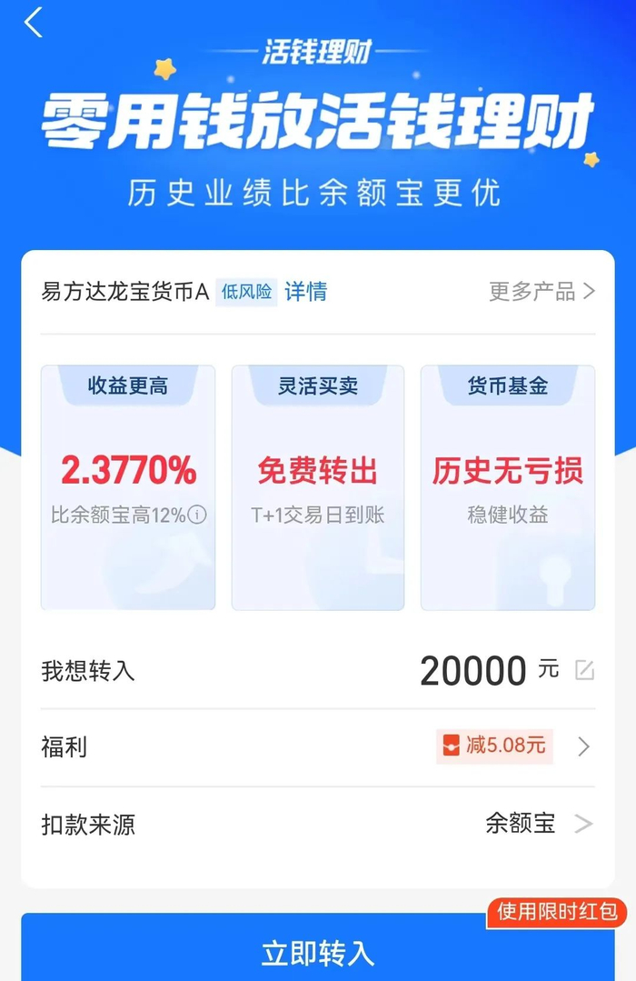 支付宝最近在余额宝和黄金票的页面宣传“闲钱理财”,并且抛出了5.08元的红包作为诱惑,不过这个红包需要申购20000元指定货币基金才可以使用: