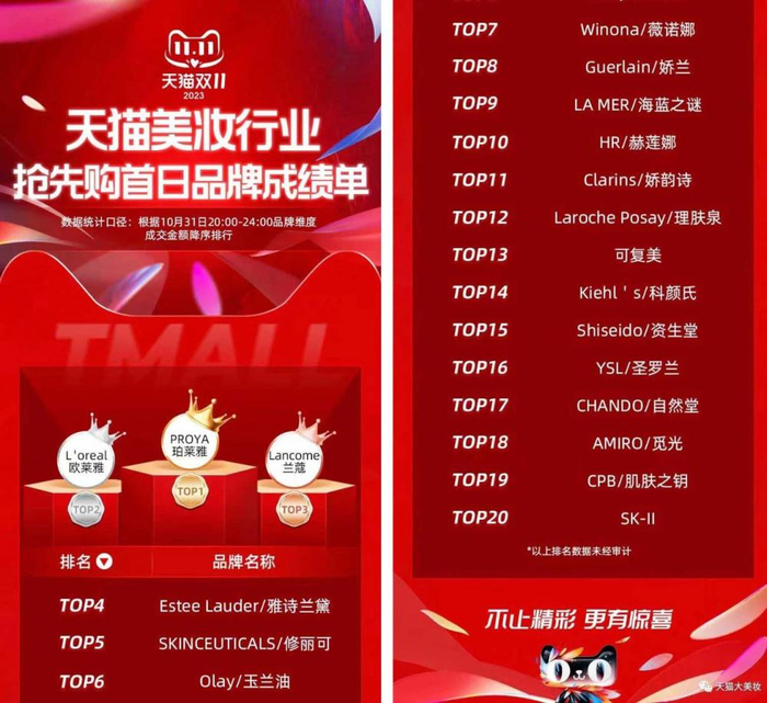 11月1日,天猫发布“美妆行业抢先购首日品牌成绩单,自然堂排在第17位。
