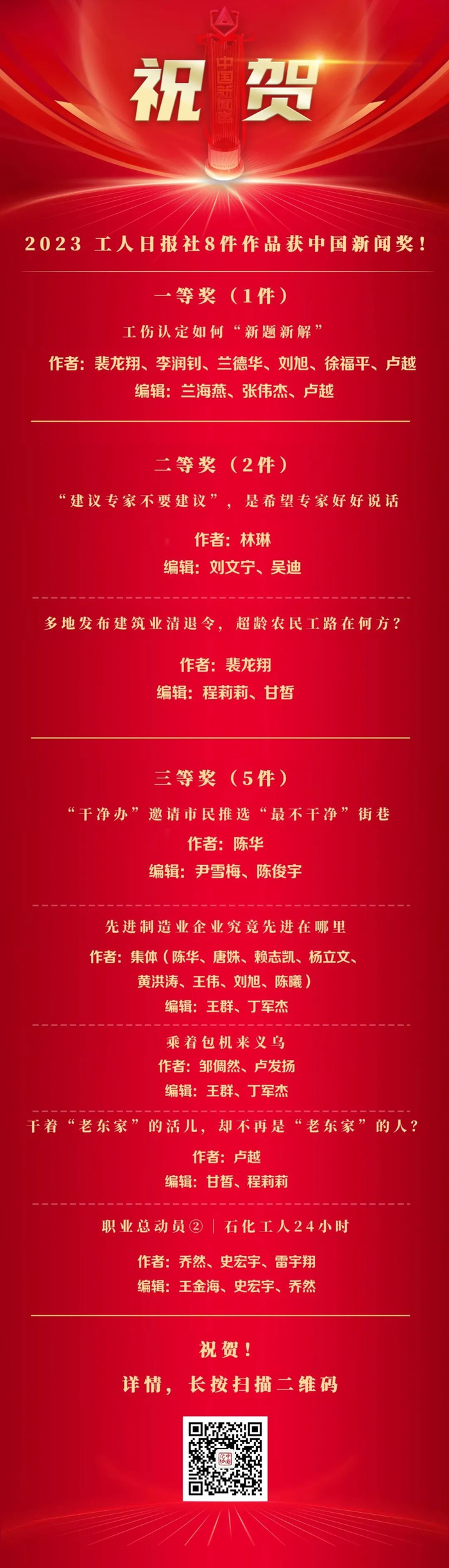 工人日报8件作品获中国新闻奖。其中,系列报道《工伤认定如何“新题新解”》获一等奖;评论《“建议专家不要建议”,是希望专家好好说话》等2件作品获二等奖;消息《“干净办”邀请市民推选“最不干净”街巷》等5件作品获三等奖。