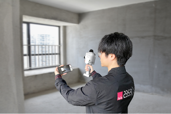 (设计师正在使用3D信息自动采集量房设备)