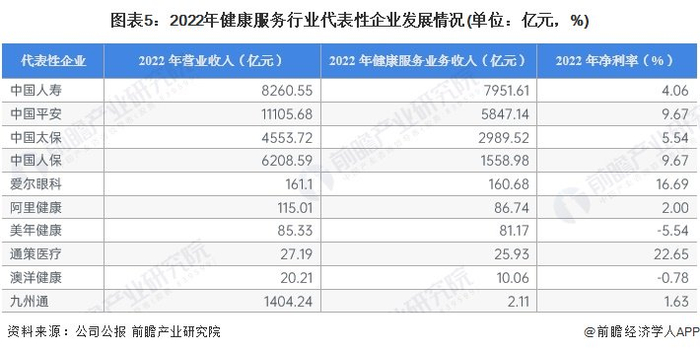 从健康服务行业中游企业2022年的业绩来看,营收方面,各大健康服务保险公司的营收表现较强;净利率方面,提供专业健康服务等企业净利率表现较强。其余健康服务行业代表性企业业绩如下:
