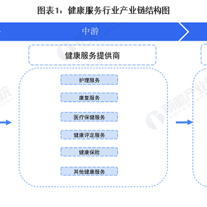 从我国健康服务行业产业链结构来看,上游为健康制造业,主要包括医疗器械及耗材制造、健身器械、医疗药品等行业,此外还包括其他服务提供商,如医疗信息化服务等;中游为健康服务业,主要包括康复护理业、医疗服务行业、健康管理服务、健康保险等;下游则是各类医疗健康机构及消费者。