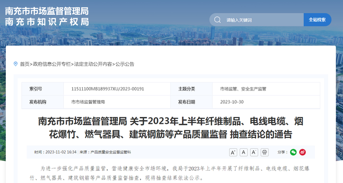 四川省南充市市场监督管理局公布2023年上半年燃气灶、灭火器和电动自行车产品质量监督抽查情况
