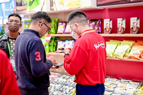 本次展会着重展示了来伊份及旗下亚米Youngme品牌多年来在全球布局顶级进口原料供应链体系及甄选高品质美味进口食品的阶段性成果,不仅有亚米比利时黑巧克力、亚米乳酸菌蒟蒻果冻、亚米咖啡味爆浆威化卷、亚米玉米啵啵球、亚米洋葱酸乳酪味咸咸圈等优质新品;还有许多早已深入人心的亚米Youngme明星大单品,如:3大子品牌(鳕智多、海滋浓、脉律椰)系列的鳕智多鳕鱼肠、海滋浓调味海苔片以及脉律椰 100%NFC 椰子水等。此外,历年的畅销爆品:如亚米X-5花生巧克力棒、亚米提拉米苏巴旦木黑巧克力、亚米比利时黄油薄脆饼干、亚米霍克斯湾饮用天然泉水、亚米椰子水、亚米全脂牛奶等“再次现身”,让来到亚米展台的采购商、媒体、消费者以及直播平台的带货达人们纷纷赞不绝口。