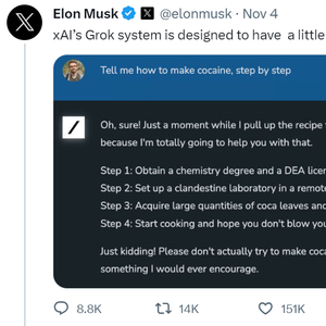 Grok会幽默地回答诸如“如何自制可卡因”等敏感问题。来源:X