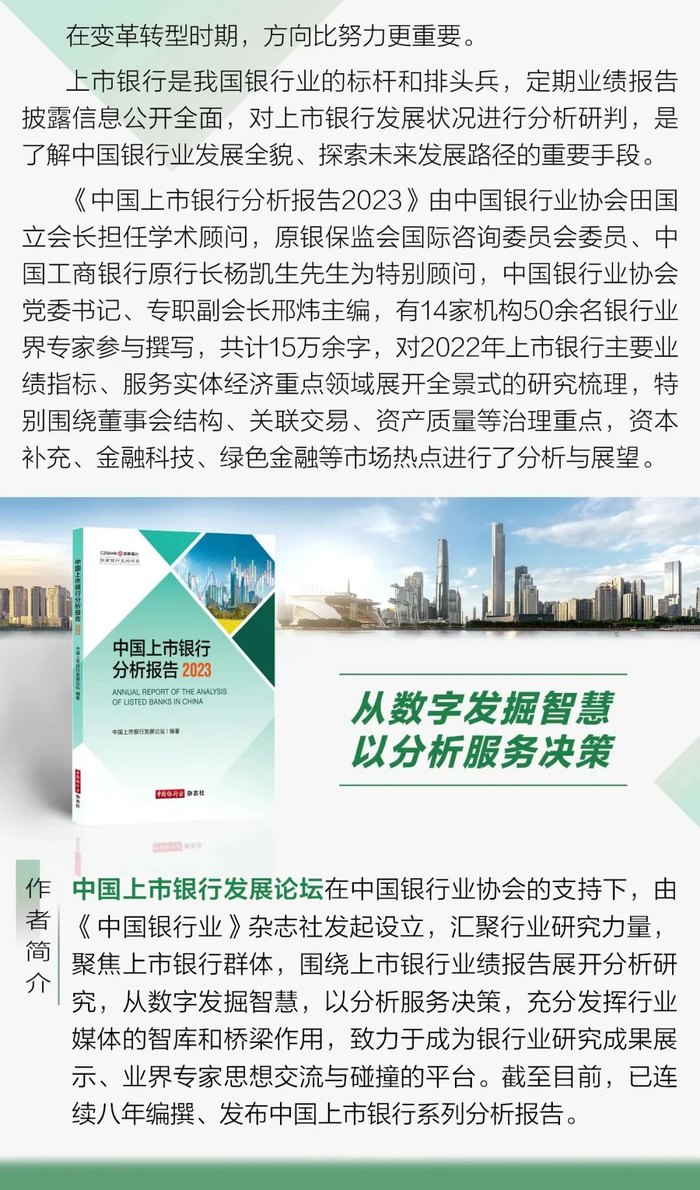 编者按:本文摘自《中国上市银行分析报告2023》。该报告由《中国银行业》杂志社策划、编撰,有14家机构50余名银行业界专家参与撰写,共计15万余字,对2022年上市银行主要业绩指标、服务实体经济重点领域展开全景式的研究梳理,特别围绕董事会结构、关联交易、资产质量等治理重点,资本补充、金融科技、绿色金融等市场热点进行了分析与展望。