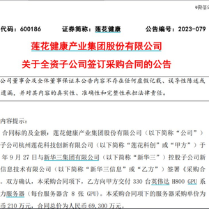 莲花健康以食品生产经营为主营业务,产品主要包括以“莲花”牌味精、“莲花”牌鸡精、“九品香”调味料为主的调味品系列。9月28日,莲花健康披露公告称,计划斥资6.93亿元向新华三采购330台英伟达算力服务器。10月10日晚间,莲花健康在披露的异动公告中称,该公司计划从事算力租赁业务的业务模式主要为公司负责投资建设智能算力中心,需要购买大量固定资产,为下游各行业客户提供面向人工智能业务的算力租赁云服务。