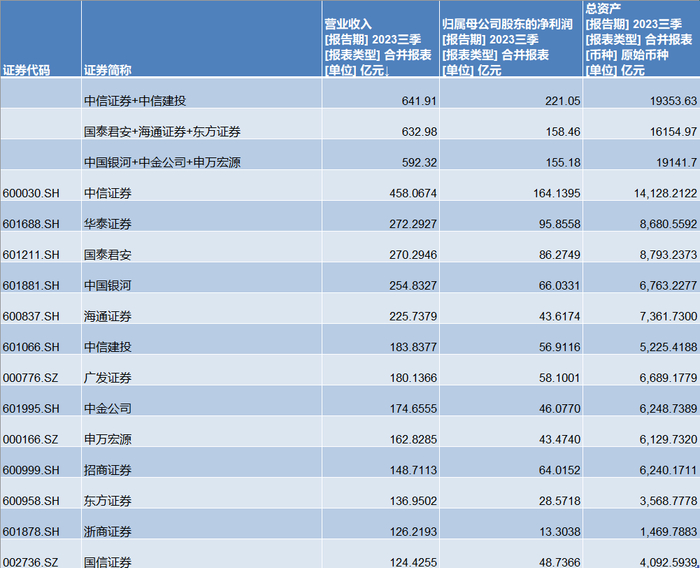 目前,上市券商三季报已披露完毕。澎湃新闻记者根据三季报数据简单测算,如果有并购传闻的券商进行合并,将出现三家营业收入或总资产等经营指标超过中信证券的机构。