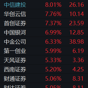 11月6日,在证监会支持头部券商公司加快并购重组的背景下,券商股领涨两市。其中,方正证券(601901)、国联证券(601456)等涨停,中信建投(601066)涨逾8%,中国银河(601881)涨近7%。