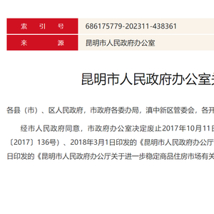 11月2日,昆明市人民政府官网发布《昆明市人民政府办公室关于废止一批房地产政策文件的通知》(以下简称《通知》),决定废止2017年、2018年出台的相关房地产政策。