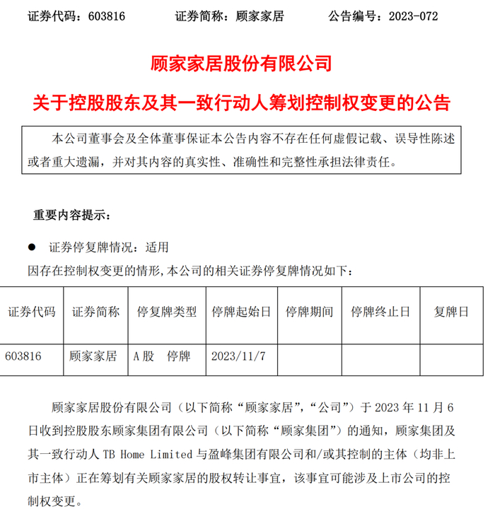 早间申请紧急停牌后,顾家家居(603816)在11月6日盘后官宣了停牌事由:控股股东顾家集团正在筹划控制权变更事项,而接盘方或为美的集团何享健之子何剑锋。