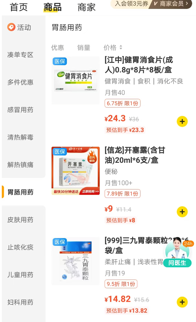 记者在第一医药(灵林店)看到,常见的胃肠药如健胃消食片、开塞露、三九胃泰颗粒等均支持医保线上支付。而在订单支付界面,系统会明确提示医保支付最高金额。