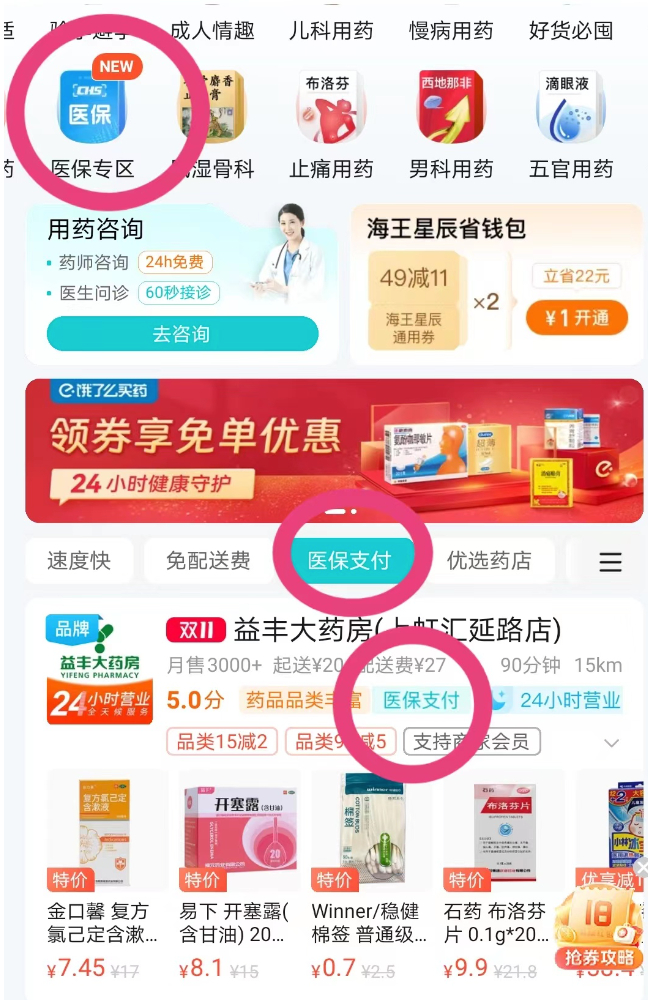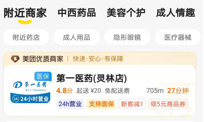 而在美团APP的“美团买药”栏目中,部分药店也明显标注了“医保”图标,表明可以支持医保线上支付买药。