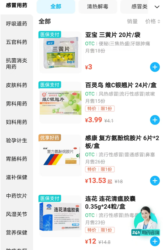 在益丰大药房(上虹汇延路店)内,记者发现,常见的感冒药如维C银翘片、三黄片、连花清瘟胶囊等均支持线上医保支付。
