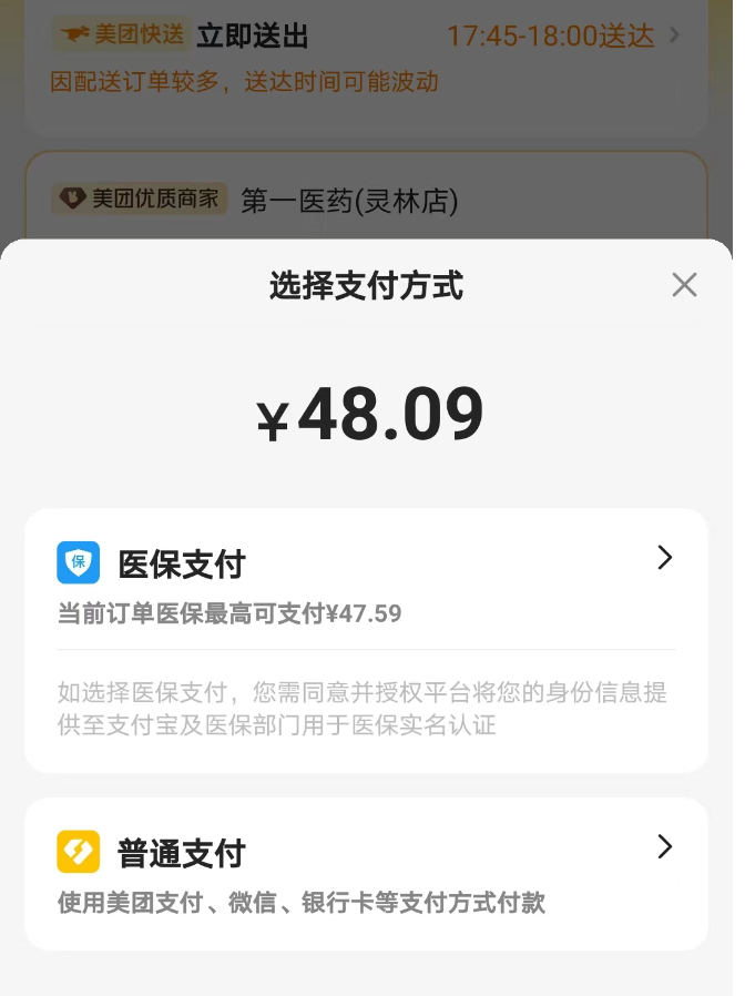 在美团APP的第一医药(灵林店),记者购买了昭药维C银翘片和希尔生二氧化硒洗剂,药品售价分别为23元和27.4元,配送费0元,打包费0.5元,新客优惠1元,订单合计金额为49.9元。其中,医保支付金额为49.4元,即除0.5元打包费外,全额医保支付。