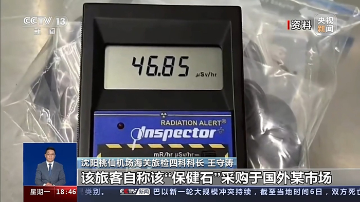 沈阳桃仙机场海关旅检四科科长 王守涛:一旅客通过我身后的固定式核辐射监测门触发报警,经过我们复查确认,该旅客随身携带的“保健石”项链核辐射超标,经过测量辐射值达到46.85微西弗/小时,超现场本底值468倍。该旅客自称该“保健石”采购于国外某市场,卖家称该保健石具有养生保健、防病防癌、延年益寿的功效。