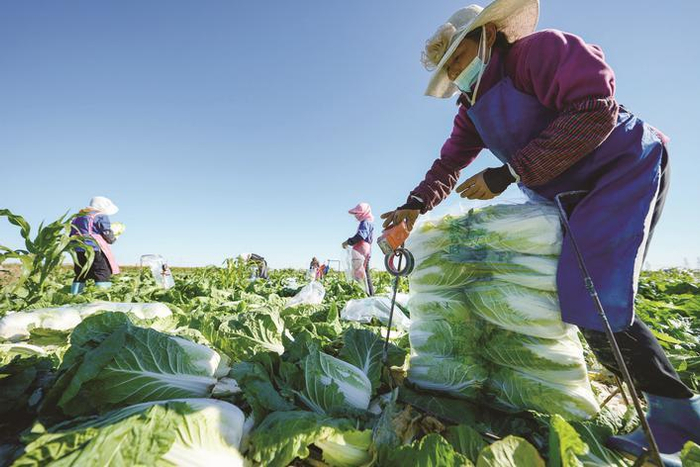 11月6日,玉田县虹桥镇后独树村农民在打包收获的白菜。时下,河北省玉田县15万亩白菜正值收获季,菜农们抢抓晴好天气收获、包装、运输,田间一派繁忙景象。玉田县是华北地区重要的蔬菜产区之一,素有“中国大白菜之乡”美誉,白菜年产量90余万吨,产品畅销北京、天津等地市场。 新华社发