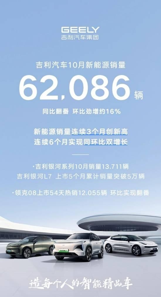 吉利汽车十月销量再创新高 翻番式跃升领跑新能源赛道