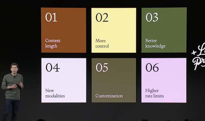 在会上,OpenAI宣布对其大型语言模型GPT-4和GPT-3.5进行更多改进,包括更新的知识库和更长的上下文窗口。
