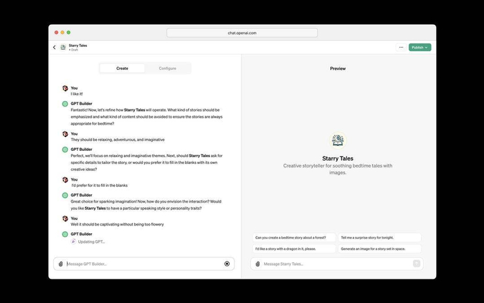 “自从推出ChatGPT以来,人们一直在寻求定制ChatGPT的方法,以适应他们特定的使用方式。”OpenAI在声明中称,“我们在7月推出了自定义指令,让您可以设置一些首选项,但要求更多控制的请求不断出现。许多高级用户都会维护一份精心设计的提示和指令集列表,并将它们手动复制到ChatGPT中。GPTs现在可以为您完成所有这些工作。”