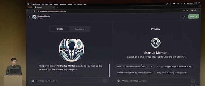 而奥特曼则演示了如何让不懂代码的人轻松定义一个GPT。“在YC工作过很多年,我总是遇到开发者向我咨询商业意见。”他讲到,“我一直想,如果有一天有个机器人能帮我回答这些问题就好了。”