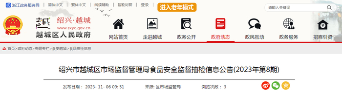 浙江省绍兴市越城区市场监督管理局发布食品安全监督抽检信息公告(2023年第8期)