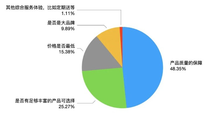 除此之外,选择购买洗衣液、纸巾、收纳用品等居家日用产品的消费者占46.15%。其中,48.35%的消费者更注重产品质量保障,其次是注重是否有足够丰富的产品可选择,占25.27%。