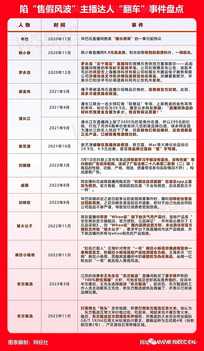 不仅是辛巴和疯狂小杨哥,罗永浩、李佳琦等头部主播直播间的商品都曾出现在王海的打假名单之列。如罗永浩在交个朋友直播间售卖的假羊毛衫、李佳琦带货涉嫌虚假宣传误导的初普美容仪、散打哥售卖用PU材质宣传真皮的腰带。此外,陈小春、潘长江、戚薇等明星主播也被曝出涉嫌售假。