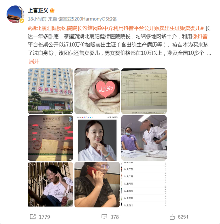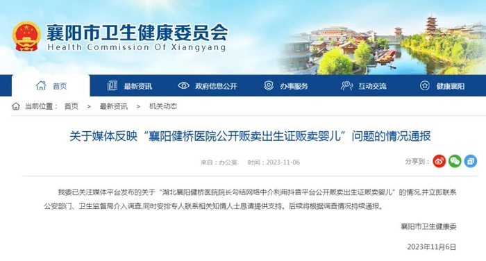 11月6日,襄阳市卫生健康委发布情况通报:我委已关注媒体平台发布的关于“湖北襄阳健桥医院院长勾结网络中介利用某视频平台公开贩卖出生证贩卖婴儿”的情况,并立即联系公安部门、卫生监督局介入调查,同时安排专人联系相关知情人士恳请提供支持。后续将根据调查情况持续通报。