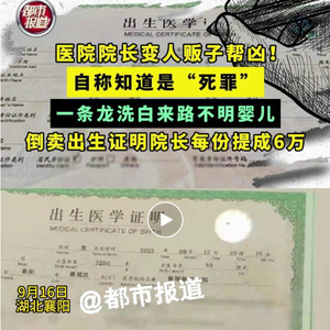 据河南广播电视台都市频道《都市接到办》6日报道,记者暗访调查一个多月,与一名倒卖出生证明的中间人联系上,对方表示只需要拿96000元,就能为孩子办理一个真实可查的《出生医学证明》,而且还可以先落户后付钱。在中间人的介绍下,记者在湖北省襄阳健桥医院,只提供了宝宝的姓名等相关信息,连宝宝都没有到场,就在医院院长叶某的亲自参与下,成功为一个“虚拟”宝宝办出真正的《出生医学证明》,而且就连“伪造”的宝妈病历档案以及宝宝的疫苗本都在医院成功备案。倒卖出生证明的中间人表示,这96000元中有66000元是医院院长的提成,而剩余的则被产房的人员瓜分。“我们犯的是死罪!”对于倒卖《出生医学证明》的严重性,院长叶某比谁都清楚,但她依然选择了铤而走险。