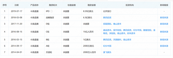 这份荣耀的背后离不开资本的助力。根据企查查数据显示,斗鱼IPO前完成6轮融资,披露金额相加约70亿人民币。