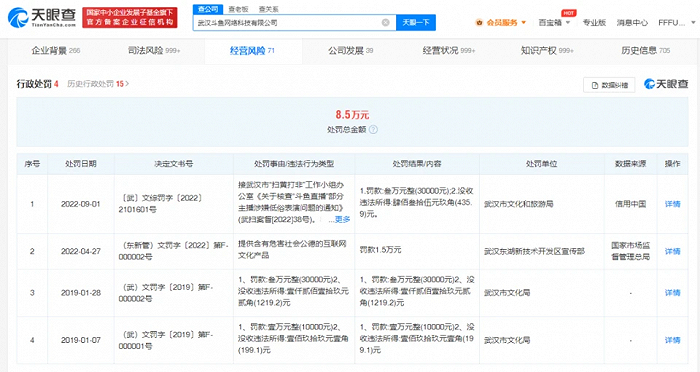 根据天眼查数据,斗鱼的“擦边球”问题属于历史遗留问题,此前斗鱼已因相关问题多次遭行政处罚。据天眼查APP显示,目前武汉斗鱼网络科技有限公司共计拥有4条行政处罚、15条历史行政处罚,处罚事项涉及低俗表演、提供含有暴力内容的互联网文化产品等。