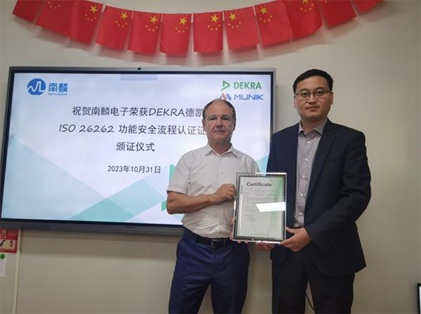 图一:秒尼科MUNIK见证南麟电子荣获德凯颁发的ISO 26262芯片功能安全证书
