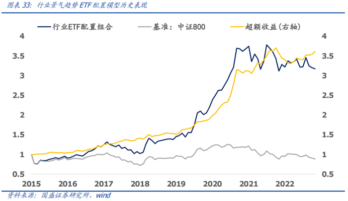 考虑到部分一级行业暂无可投资ETF,我们将行业景气模型也落实到选股层面。具体而言,我们先根据行业配置模型确定行业权重,然后根据PB-ROE模型选取行业内估值性价比高的股票(前40%),按流通市值和PB-ROE打分加权。