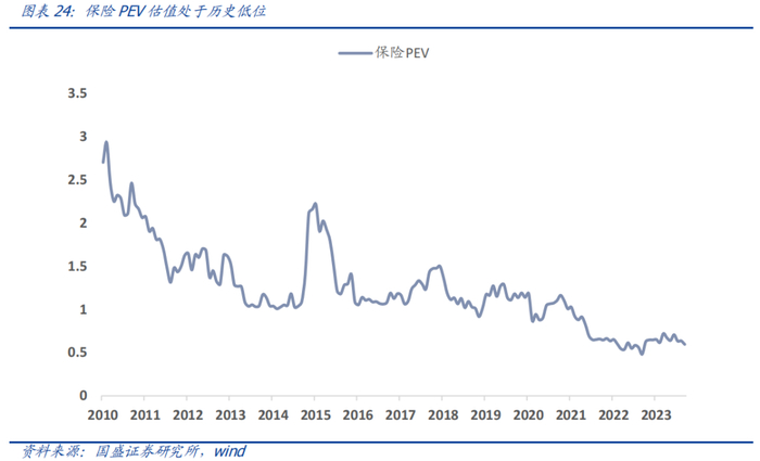 估值层面,保险行业PEV估值约为0.60,估值处于历史低位;