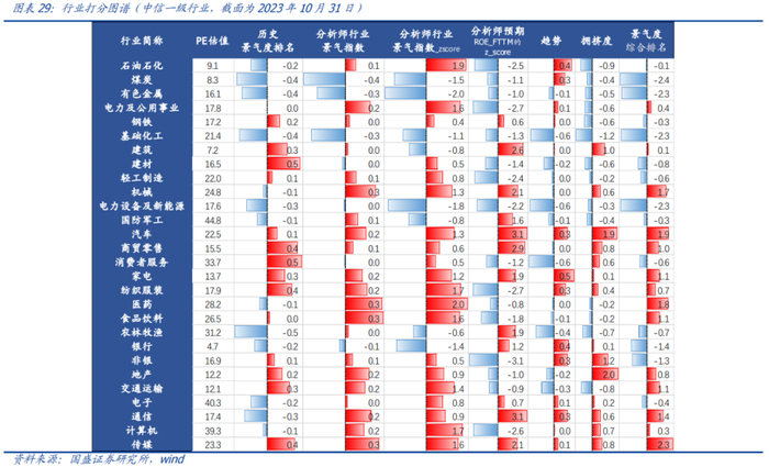 以上行业配置模型是根据中观高频数据构建的,众所周知分析师盈利预测数据是更直接便捷的盈利预测数据。考虑到近些年分析师定价权的提升,下面我们根据分析师盈利预测明细数据编制了分析师景气指数FAPI(Financial Analyst Pros Index),用于及时跟踪宽基指数、风格和行业的景气度。结合我们团队的趋势和拥挤度指标,截止2023年10月31日,行业各个分项指标如下: