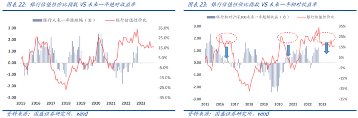 我们用银行板块的股权风险溢价衡量未来一年左右的收益预期。如下图所示,当前银行板块估值性价比指数非常高,历史这个水平的估值性价比一般对应未来一年15%左右的绝对收益。但是,当前估值水平配置银行对应未来一年的超额收益并没有显著为正。这背后的核心原因是很多其他行业估值也处于很低水平,市场真正反转的时候,银行股拉长来看并没有那么高的弹性。