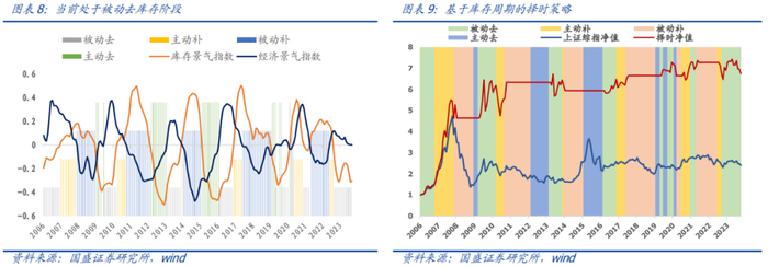 目前库存周期处于经济上、库存下的象限,也就是被动去库存阶段,我们基于库存周期构建的择时策略原则是在被动去库存和主动补库存阶段做多权益资产,考虑到经济增长指数大幅下降至0轴附近,当前权益资产观点为谨慎乐观。