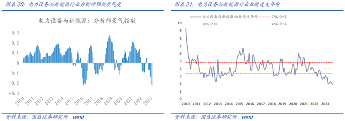 电力设备与新能源:盈利层面,分析师预期景气度处于收缩象限数月。估值层面,行业业绩透支年份当前约为2.3年,处于历史5%分位,存在一定估值修复空间。