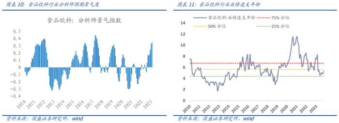 食品饮料行业:盈利层面,分析师预期景气度进入扩张区间数月。估值层面,行业业绩透支年份当前约为5.4年,处于历史47%分位,近三年看处于22%分位数,估值仍处于合理偏低水平。