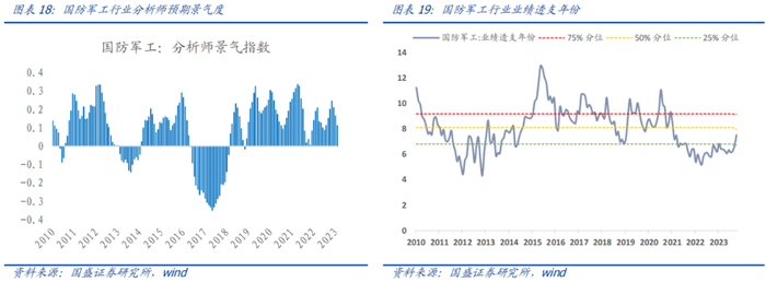 国防军工:盈利层面,分析师预期景气度处于扩张象限。估值层面,行业业绩透支年份当前约为7.5年,处于历史42%分位,近期估值有所修复,但仍处于合理偏低区间。