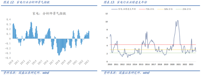 家电行业:盈利层面,分析师景气指数进入扩张区间数月。估值层面,家电行业业绩透支年份当前约为2.5年,处于历史35%分位,近期分析师上调盈利预测,业绩透支年份处于合理偏低区间,可以重点关注。