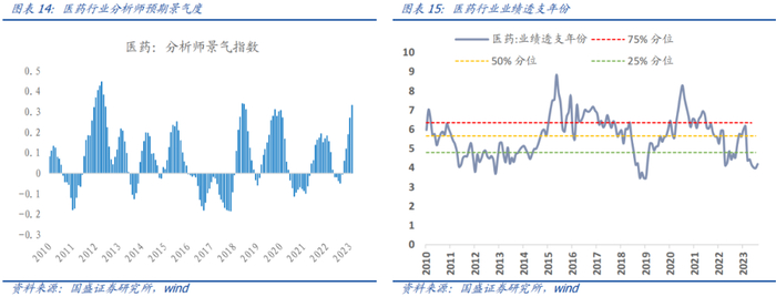 医药行业:盈利层面,分析师预期景气度进入扩张区间数月。估值层面,行业业绩透支年份约为5.1年,处于历史35%的分位数,近期估值修复明显,但仍处合理偏低区间。