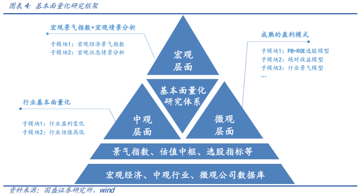目前我们基本面量化研究体系主要覆盖三个领域:宏观层面、中观层面、微观层面。